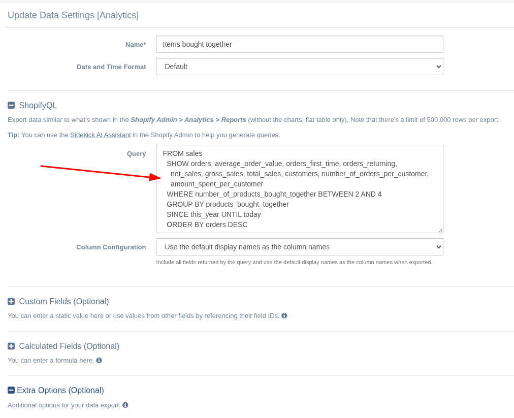 In addition to exporting the data via ShopifyQL, you can also do additional customizations to the exported data such as changing the date and time format, customizing the column names and ordering, and using Custom Fields and Calculated Fields to manipulate the data further on export.