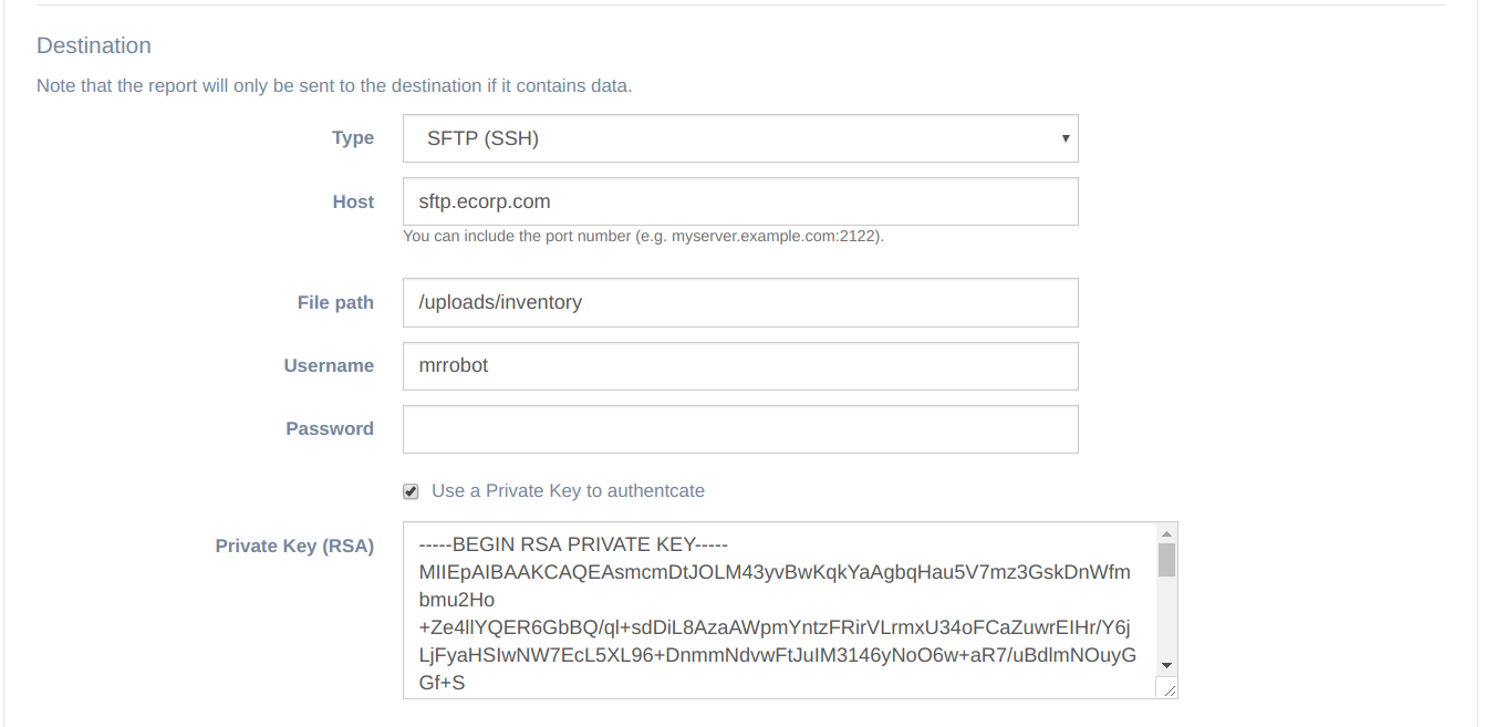 To use a private key to authenticate, simply click the "Use a Private Key to authenticate" checkbox in the Export Profile under the "Destination" section and paste your private key in the text box below it.