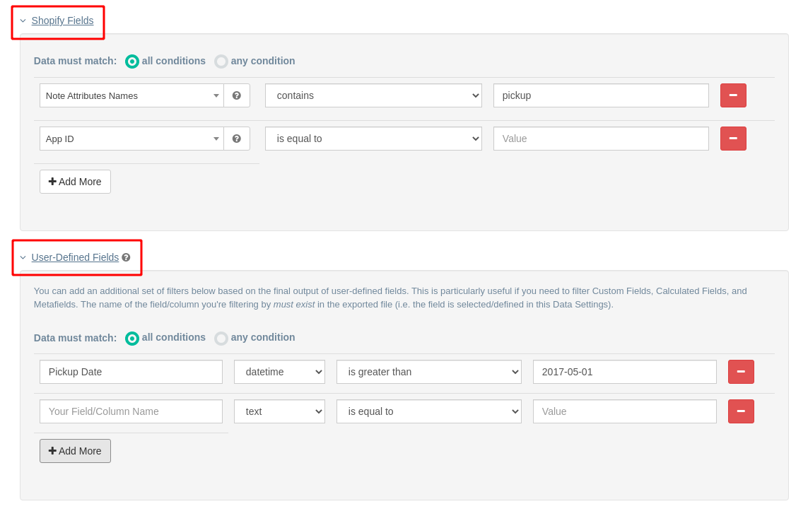 In the Custom Filters section of the Data Settings, you'll now see two separate subsections where you can add a filter group for standard Shopify Fields and another filter group for User-Defined Fields: