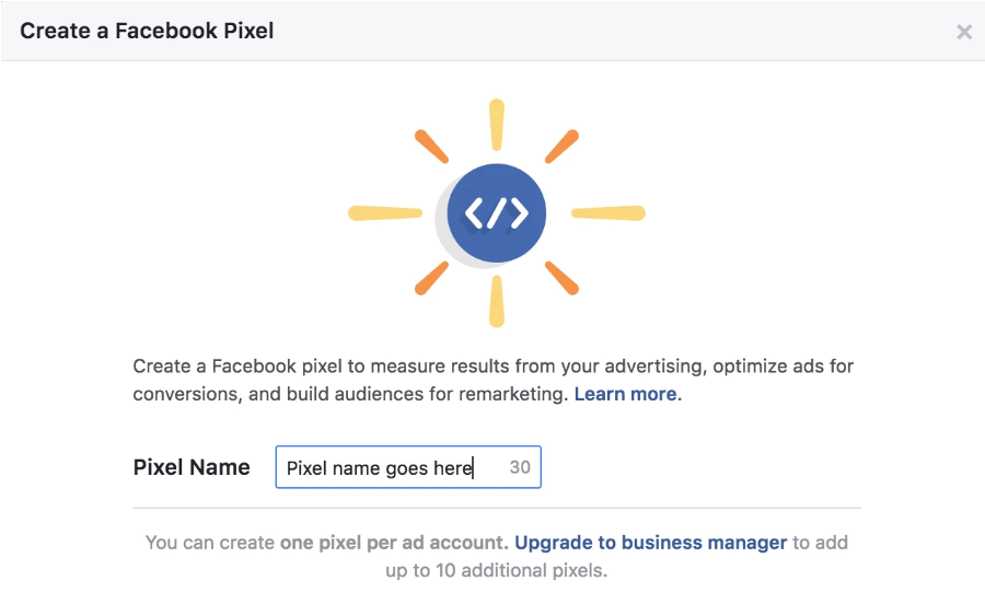 The first thing you'll want to do is open the Facebook Events Manager, click the hamburger, or menu, icon, and click "Pixels." You will then have the option to select "create new pixel." Then you'll want to name the pixel