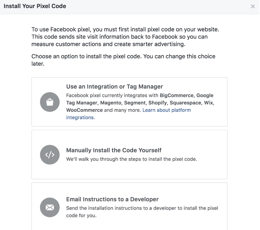 After you've named your pixel, you'll need to decide how you want to integrate Pixels. There are three ways to do this. If you're using a platform or template, you can select that option and you'll be given step-by-step instructions on how to integrate Pixels onto your site's template. If you're using a site developer, you can email them the instructions and they will take care of the rest for you. If neither of these are an option, then you'll need to copy and paste the code directly to your website.