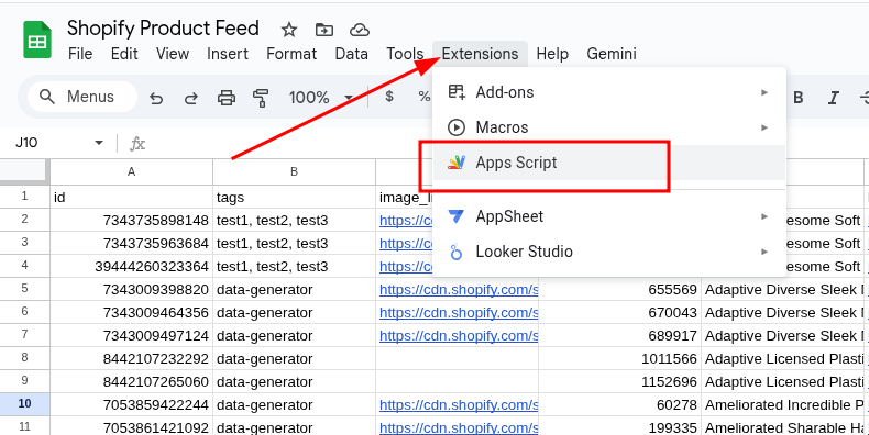1. Opent the Google Sheets spreadsheet you want to use. From the menus, click Extensions > Apps Script.