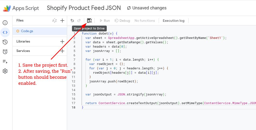 3. Click Save, then click Run to confirm the code is valid (you may get prompted to approve permissions).