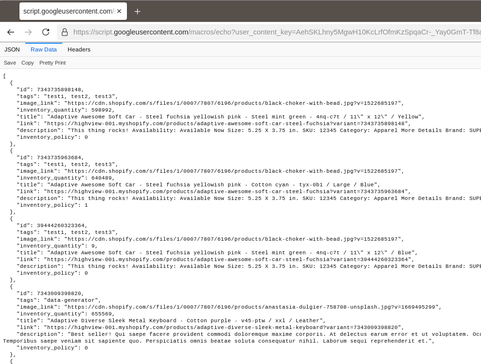 Wih tihs setup, they can basically use our EZ Exporter app to periodically push new data from Shopify to Google Sheets, and the JSON data returned by the URL generated by Google Apps Script is also updated automatically.