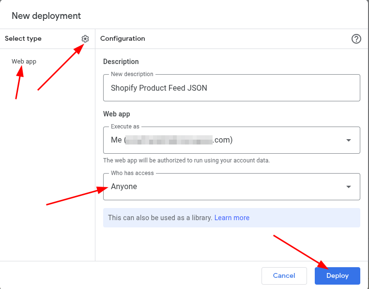 5. Select type > Web app, Who has access > Anyone, then click Deploy.