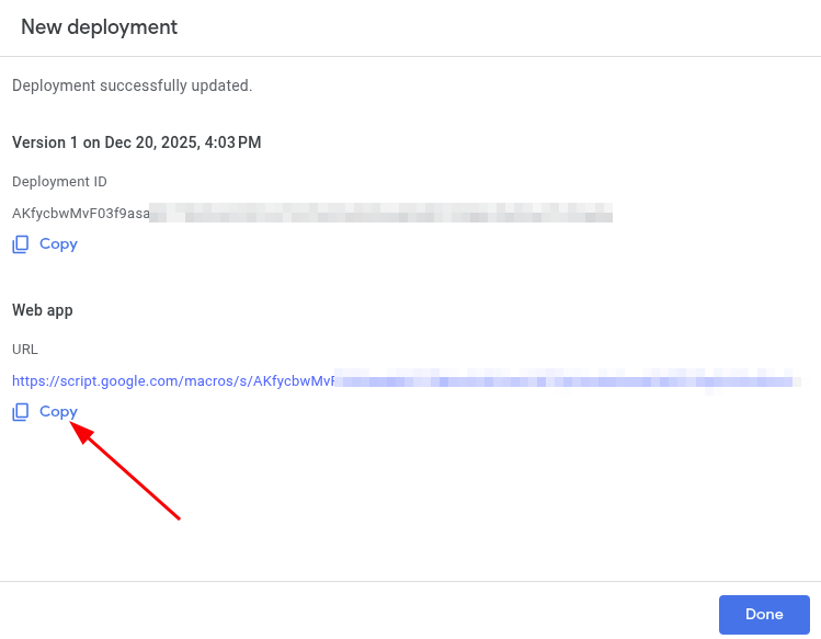 6. The web app is now live. Simply copy the URL and you're done. Visiting the URL will display a JSON feed using the data from the Google Sheets spreadsheet.