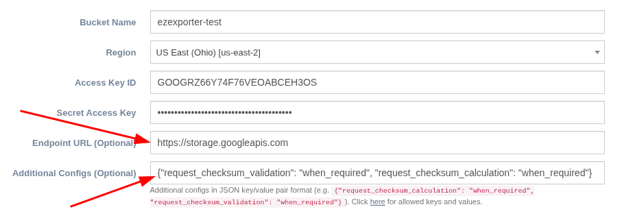 4. Enter your Google Cloud Storage bucket name, select any Region, and enter the Access Key and Secret Key you've generated via the Google Cloud Console.