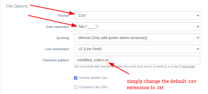 You will then have the option to specify the data separator/delimiter to use and the filename pattern: