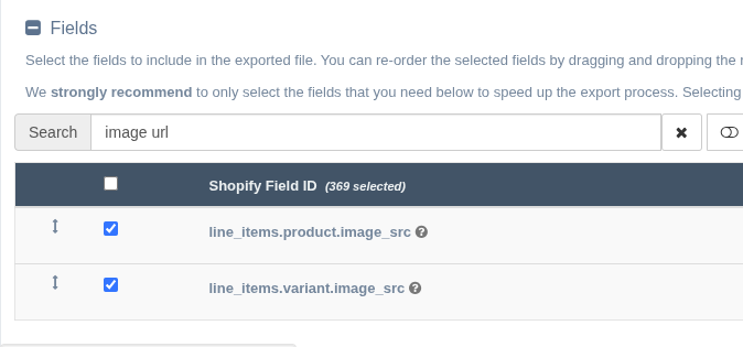 When creating a Data Settings for "Order" data, simply select the following fields to export the product or variant image URL: