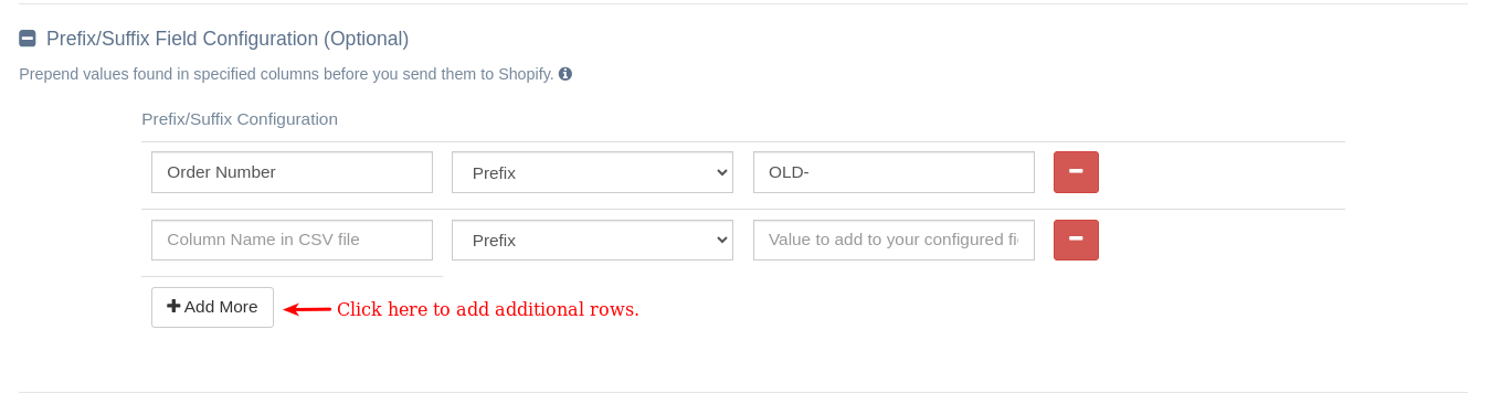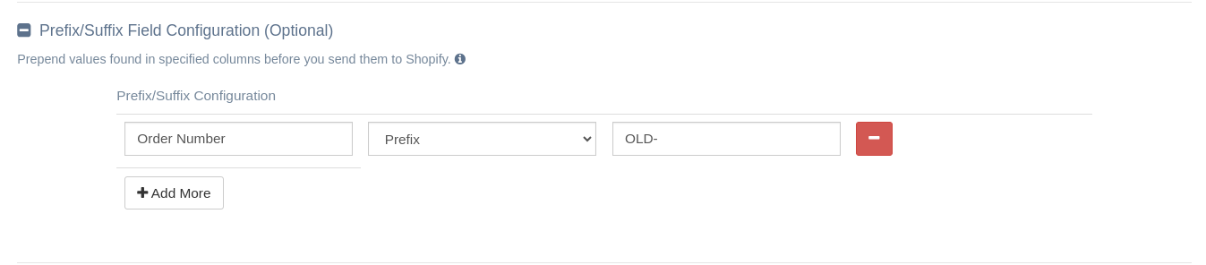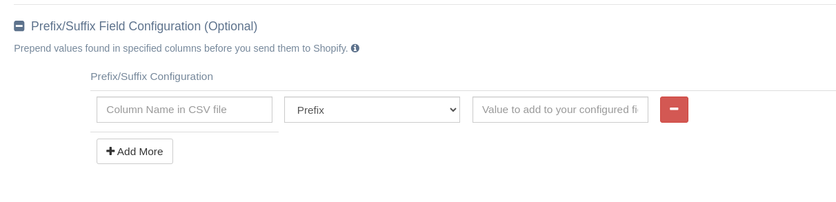 If you would like to add a prefix to more than one column in your file, click the Add More button in the Prefix/Suffix Configuration section of the data feed.