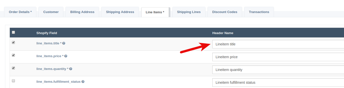 The line_item title field should be filled in with the product title. We default the title header to "Lineitem title" which is the same header used by the Shopify csv export tool. If you are using another header name for your product title you can easily change the Header Name in your data mapping.